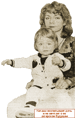 Наташа уступила-таки своему воздыхателю и вышла за него замуж. Свадьбу отгрохали на зависть всем. Фантазер Денис напридумывал столько фенечек, что и не снилось профессиональному тамаде. А вскоре у супругов родилась дочь, которую назвали необычным именем Алеся. В то утро, когда на свет появилась их девочка, Наташа не узнала двор роддома. Несмотря на трескучий мороз, дерево под окном ее палаты цвело. Это счастливый отец всю ночь привязывал к веточкам цветы....Перед рождением дочки Наташа Гусева работала в НИИ микробиологии и эпидемиологии. Она принципиально не стала поступать в театральный, пошла в непристижный Институт тонкой химической технологии. Сейчас воспитывает дочь и, кажется, довольна своей судьбой. |