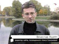 Сюжет, по моему мнению, получился неплохой. Дикторский текст, наложенный на видеоряд, составленный из фрагментов фильма и фото из альбома сайта. Несколько общих планов людей на аллейке. Слава сказал несколько умных фраз, как всегда, коротко и посуществу. Сергей К.: Не плохой сюжет, не плохой. Жаль только. что Наташу "живьём" не показали, а использовали отрывки из "Гостьи" и фотки с сайта. Georg: Симпатично получилось... "Именно Алису, а не Наташу Гусеву окликали на улицах и т.д." Чего это они на это так нажимали? "Заниженная цифра в 3 миллиона алисоманов" - это тоже звучит неплохо. Gnoom - спасибо за комментарии, как всегда, спокойно и по делу. Александр Ходаков: Сюжет посмотрел, остался доволен. Конечно, они допустили некоторую неточность, сказав, что "алисомания началась после 1-й серии фильма", ну да ничего. Отдельное спасибо Gnoom'у. Mikk: А ничего так получилось. Бедная Наташа-Алиса, которую мельком снимают на улице, знаменитые "синие" фотографии в откорректированном цвете, и толпа странных мужичков, обдирающих рябинки. Благодаря skor-у вы можете посмотреть этот ролик. Для тех, у кого проблемы с закачкай - аудиоверсия сюжета: |