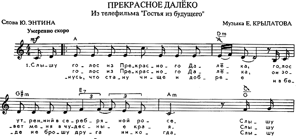 Am, C, D, Em Em B Чего только нету, чего только нет Em B На этом на белом на свете... C D G Нам выпал счастливый, но трудный билет: C B Мы века двадцатого дети. Em B Небесная высь, океанское дно E E Am Раскроют секреты однажды. D D G Нам жить интересно и весело, но... Am Em B Но все-таки хочется, хочется стра-a-шно Припев: Em Em Хоть глазочком заглянуть бы, C D Заглянуть в грядущий век G Em И узнать бы что за судьбы, Am B C И узнать бы что за судьбы Am D#dim Em Ждут тебя, ждут тебя, человек.